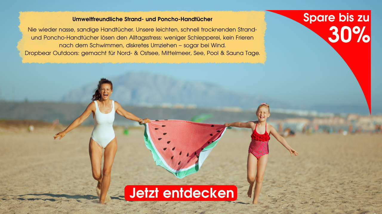 Leicht und kompakt – dein perfekter Begleiter für Strandausflüge, Poolpartys und spontane Abenteuer. Schluss mit klobigen, triefenden Handtüchern: Dein (Poncho-)Handtuch passt in jede Tasche, trocknet blitzschnell und ist sofort wieder einsatzbereit.